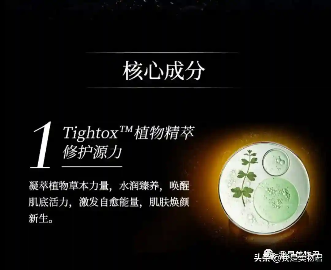 tightox萃取自植物干细胞,能够促进胶原蛋白生成,从而缓解脸部肌肉收缩来减淡细纹,从根源上祛皱。