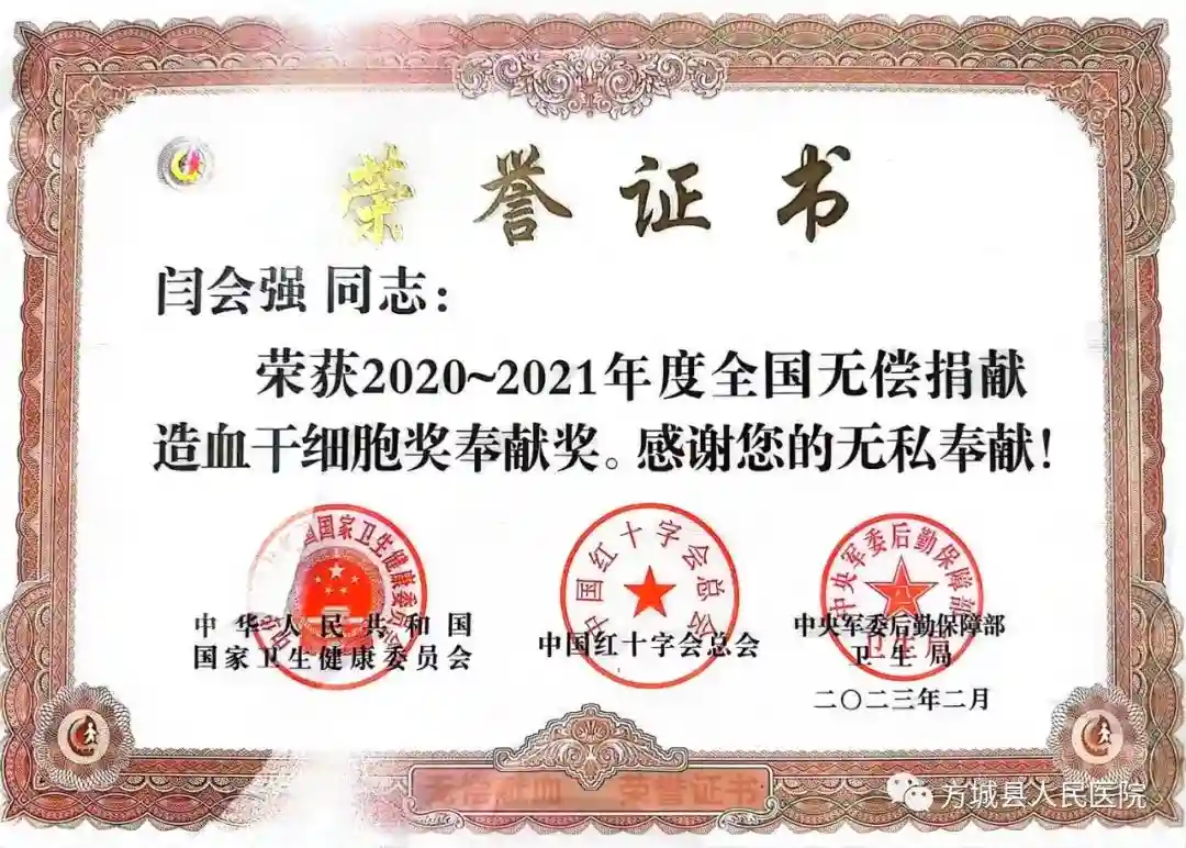 11月11日,我院职工闫会强荣获2020—2021年度全国无偿捐献造血干细胞奖奉献奖。