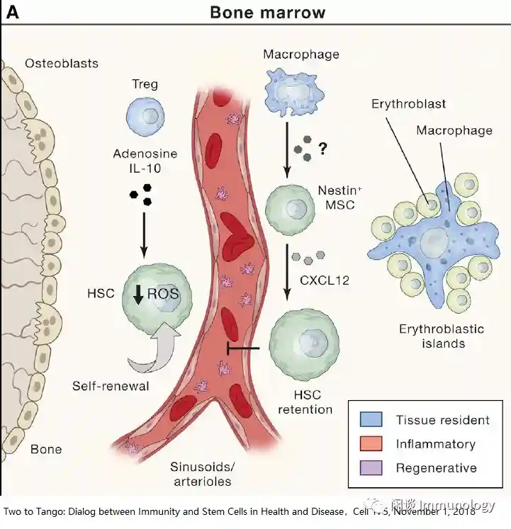 在骨髓,巨噬细胞维持造血干细胞滞留。CD169+组织驻留巨噬细胞通过间充质干细胞(MSCs)增强CXCL12的表达,限制造血干细胞进入血液。
