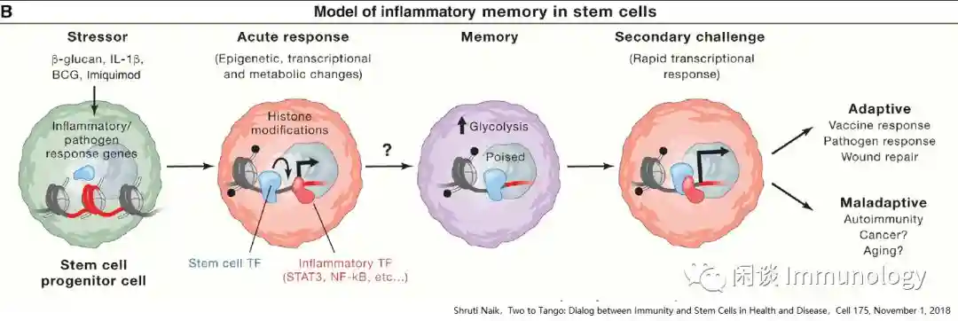 干细胞寿命比较长,会经历很多炎症,并且保留炎症的记忆。干细胞可以是训练免疫的一部分,对于非特异性的刺激存在免疫记忆。