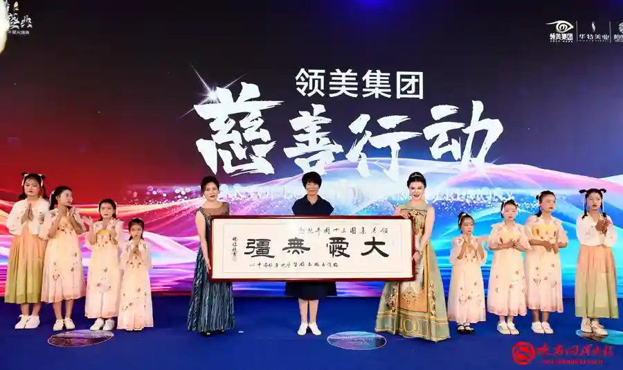 领美集团一直致力于社会公益事业。宴会现场,手语舞蹈《感恩的心》吸引全场目光。据了解,表演这支舞蹈的孩子们来自临渭区桥南镇留守儿童服务中心,在留守中心遇到困境的时候,领美集团董事长刘子瑄出手相助帮助他们渡过难关。留守中心张院长激动的说,“我们非常感激刘总,这份恩情我们也会一直铭记。”在现场,留守中心还为领美集团送上写着“大爱无疆”的牌匾,董事长也为孩子们送上了新书包,孩子们亲切的称她为“刘妈妈”。这不正是人间大爱——感恩。