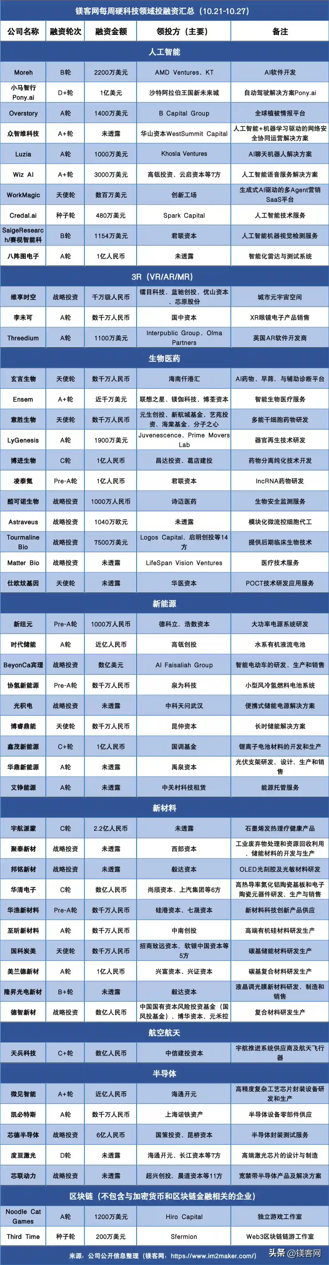 根据公开信息统计,本周硬科技领域投融资事件一共51起,其中,生物医药领域发生11起融资事件,占比21.6%;人工智能、新材料领域各发生10起融资事件,分别占比19.6%;新能源领域发生9起融资事件,占比17.6%;半导体领域发生5起融资事件,占比9.8%;3R(VR/AR/MR)领域发生3起融资事件,占比5.9%;区块链领域发生2起融资事件,占比3.9%;航空航天领域发生1起融资事件,占比2%;