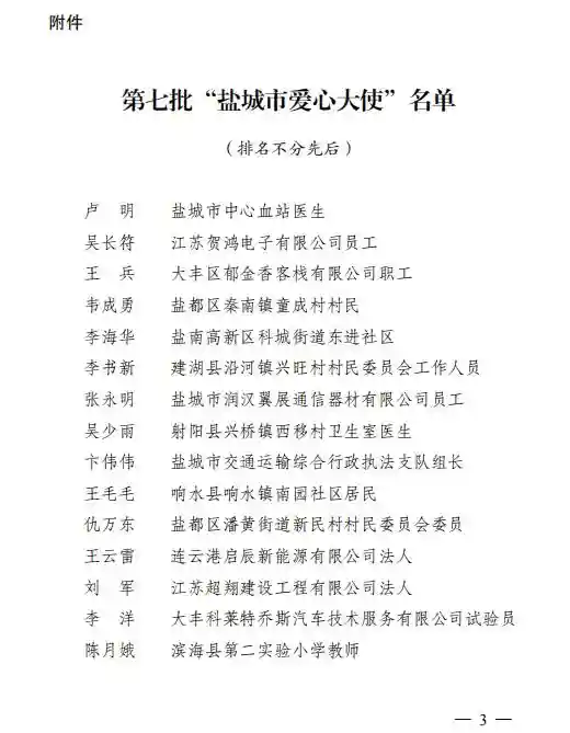 现代快报讯(通讯员王金海记者姜振军)现代快报记者从盐城市文明办获悉,在第75个“5·8”世界红十字日前夕,为进一步推动盐城市捐献造血干细胞工作深入开展,在全社会形成崇德向善、助人为乐的良好风尚,盐城市委宣传部、市文明办、市红十字会近日联合发文,授予卢明等15名同志第七批“盐城市爱心大使”荣誉称号。