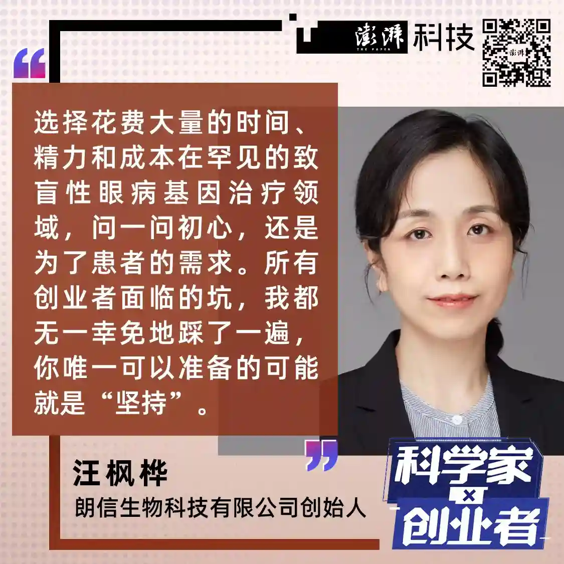 2022年11月,中国第一款针对包括先天性黑矇症(LCA)在内的遗传性视网膜变性基因治疗药物“LX101注射液”在北京同仁医院和上海市第一人民医院完成了I期临床研究的最后2例患者给药,该药物由朗信生物旗下上海朗昇生物科技有限公司自主研发。20年前,当朗信生物的创始人汪枫桦还是一名刚刚进入临床的眼科医生时,她第一次接触到了基因治疗,并有了研发遗传病以及致盲性眼病新技术的想法;20年后,当她终于有机会将想法变成现实时,她决定放弃医生的职业,全身投入这项成果转化的事业。虽然在过去两年里,首次创业的汪枫桦踩过了无数“创业黑洞”,也要不断接受商业化的拷问。但在她看来,这些都是“让更多患者受益”也正是一名医学从业者创业的意义。日前,汪枫桦在位于上海张江的朗信生物办公室向澎湃科技分享了她从眼科临床医生到创业者的经历。