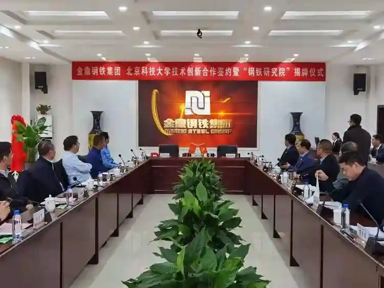 共同观看金鼎钢铁集团和北京科技大学宣传片金鼎钢铁集团有限公司是一家集烧结、炼铁、炼钢、轧钢、发电于一体的综合性钢铁企业。连续多年进入“中国企业500强”“中国制造业企业500强”“河北省百强企业”,2017年获得首批国家级绿色工厂。金鼎钢铁已从规模的粗放发展转向注重创新驱动和品质的提升,通过自身研发队伍的建设、管理模式的创新、信息自动化的不断推进,每年投入科研资金数亿元,以各种方式网罗技术性人才,组建高水平的科研团队,不断开展市场调研、用户技术研究,研发不同的新产品,切实满足市场、客户的实际需求。瞄准高端化、智能化方向发展,金鼎钢铁集团不断加强工艺装备技术改造,加快“高、精、专、新”钢材产品研发应用,不断提高科技含量和产品附加值。