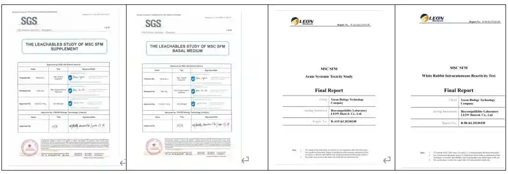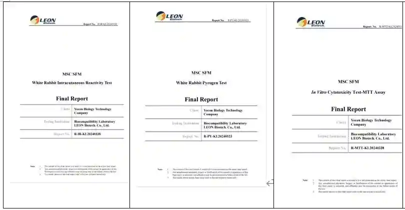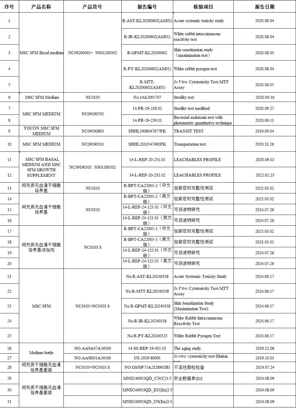 友康在向美国FDA提交间充质干细胞无血清培养基的510(K)申请期间,递交了包括可沥滤物研究、急性全身毒性研究、白兔皮内反应性试验、皮肤致敏研究、白兔热原试验、体外细胞毒性试验、无菌试验等几十项干细胞培养基相关检测报告。这些报告均是由美国FDA认可的国际权威三方检测机构出具,友康的间充质干细胞无血清培养基均通过了以上技术检测。