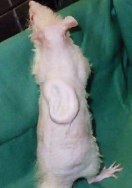 2个月后,塑胶支架就能自动溶解,而老鼠的背部则长出了5cm长的耳朵。