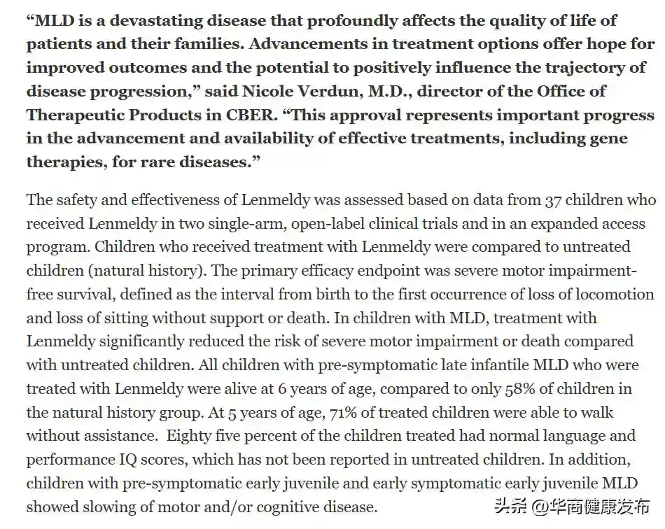 研究结果显示,与未经治疗的儿童相比,Lenmeldy治疗显著降低MLD患儿的严重运动障碍或死亡风险。所有接受治疗的症状前晚期婴儿形式的MLD儿童都活到了6岁,而如果任疾病自然发展,6岁时患儿的存活率只有58%。