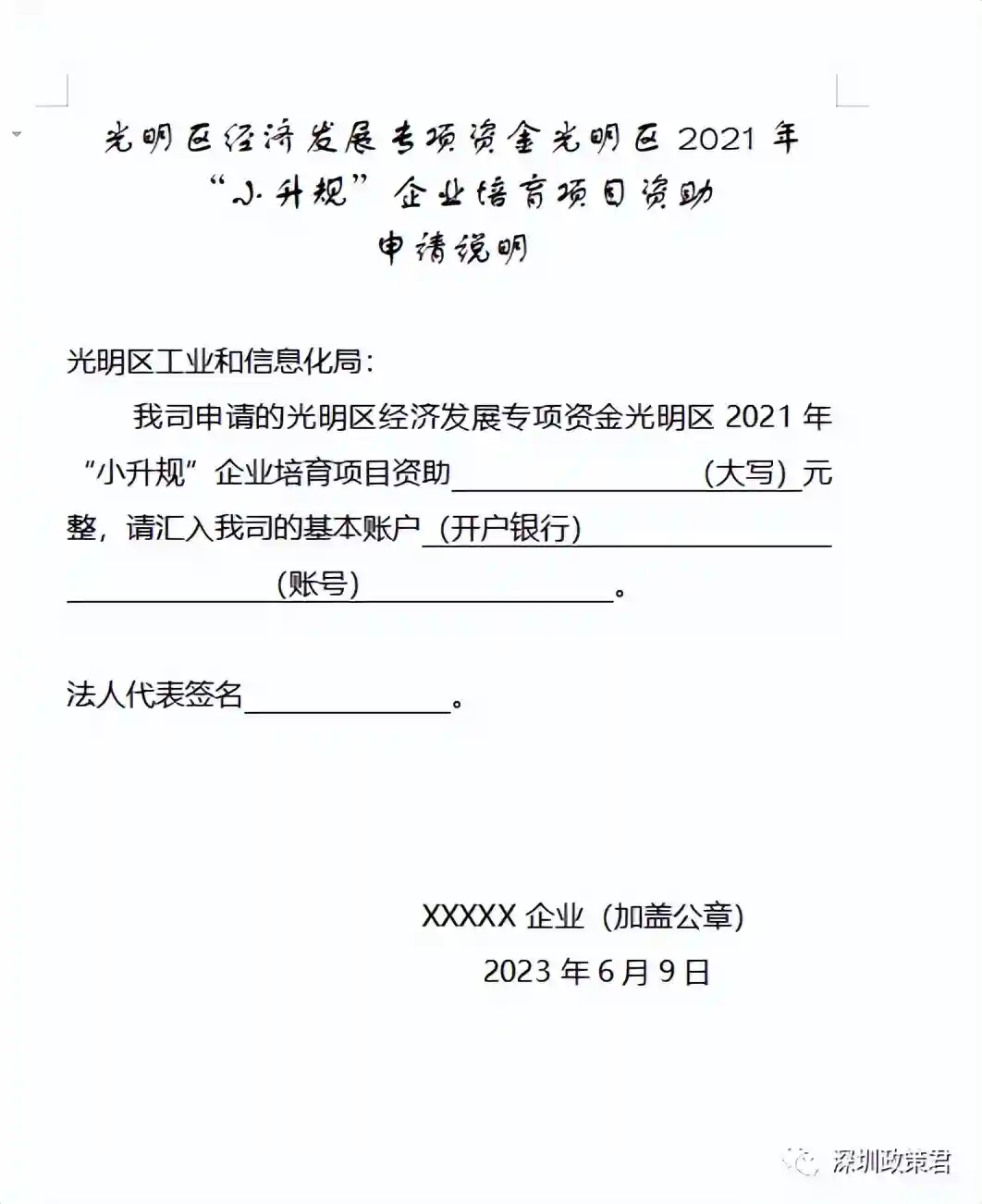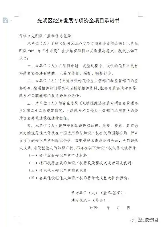 光明区工业和信息化局关于光明区2021年“小升规”企业培育资助项目的公示根据《光明区经济发展专项资金管理办法》(深光府规〔2022〕9号)规定,现将光明区2021年“小升规”企业培育资助项目在深圳市光明区政府在线(网址)予以公示,公示时间为2023年6月2日至2023年6月8日(5个工作日),现向社会广泛征求意见。