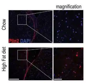 通过对肥胖小鼠大脑神经元的进一步分析,研究人员还发现,与正常饮食的小鼠相比,肥胖小鼠侧脑室区域的神经胶质细胞表达了更多的衰老标志物,并且脂滴包被蛋白(perilipin2,Plin2)的表达也更多,说明肥胖不仅促进衰老细胞的产生,还促进这些衰老细胞积累脂肪。