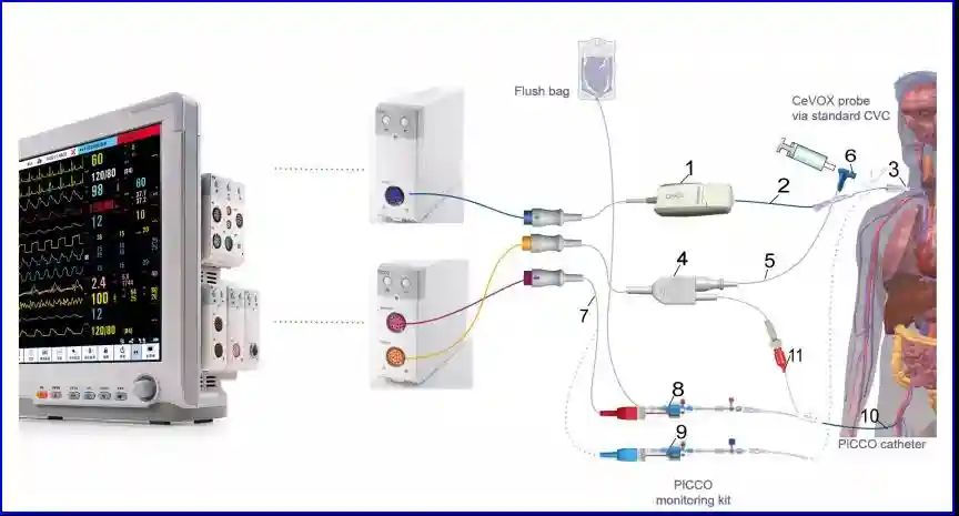 PICCO(PulseIndexContinuousCardiacOutput),可以测定动脉压、心率、每搏输出量等。脉搏指示连续心排血量监测,可反映心脏的状态(前负荷、后负荷等);可以计算测量胸内血容量和ELWI(血管外肺水),可评估肺水肿的情况;能反映体循环中小动脉病变等情况;能反映心肌收缩力等,为重症心衰患者提供量化的观察指标。