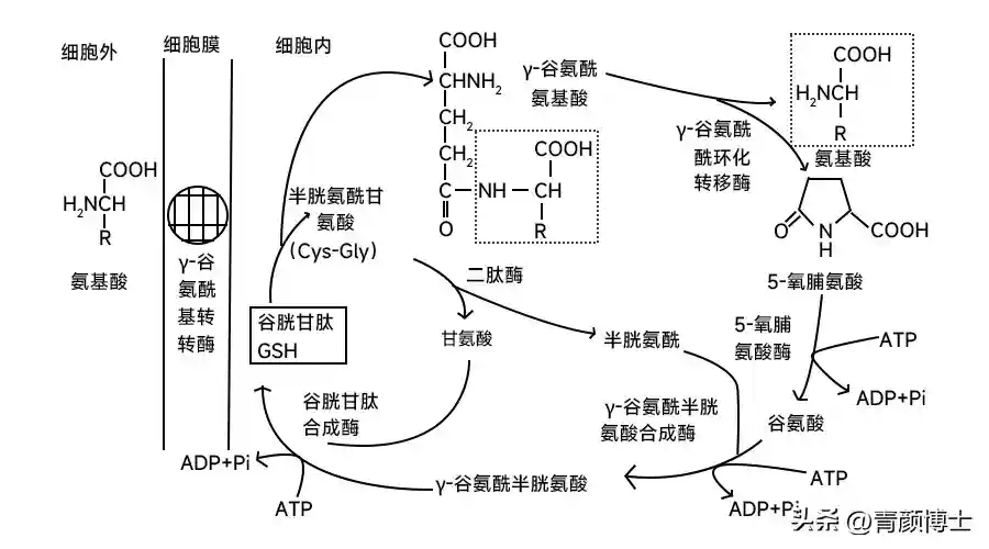 Meister提出了关于氨基酸吸收的γ-谷氨酰基循环,他认为氨基酸吸收及其向细胞内的转运过程是通过谷胱甘肽起作用的,反应过程可以分为两个阶段,即谷胱甘肽对氨基酸的转运和谷胱甘肽的再合成,并构成一个循环[4]。