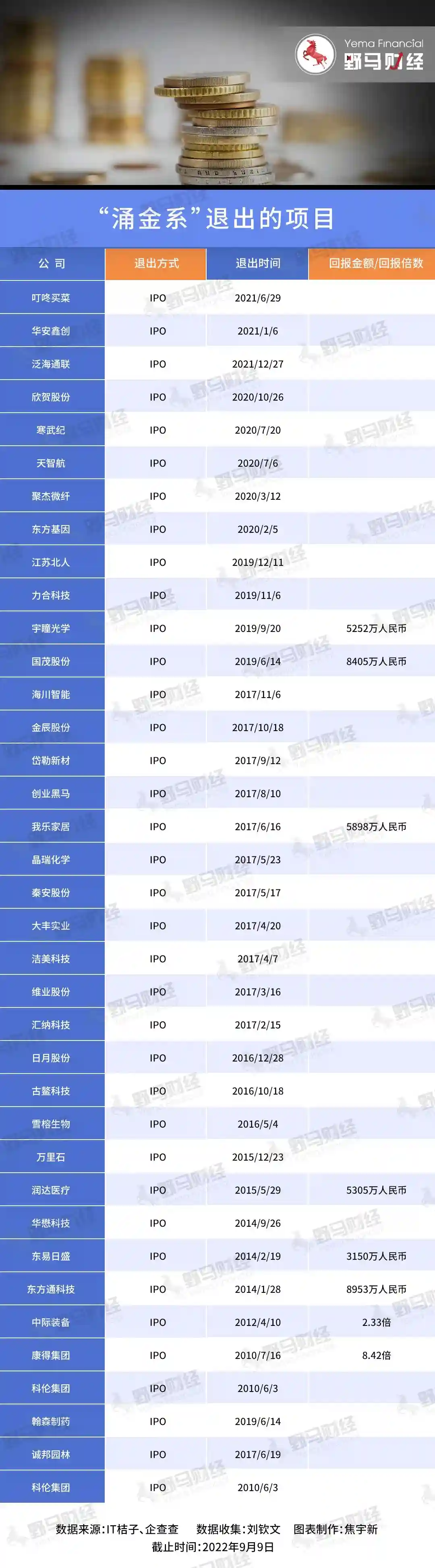 2022年6月27日,金沃股份公告称,“涌金系”旗下基金宁波涌耀等计划在15个交易日之后六个月内减持751万股(为全部持股数)。以9月13日的28.82元/股计算,“涌金系”将套现约2亿元。