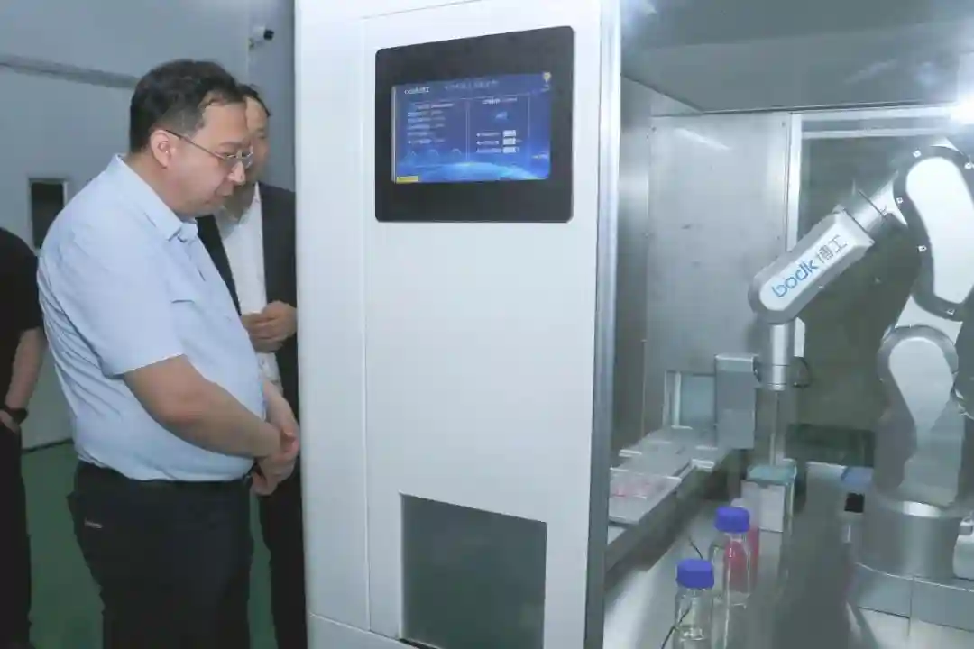 在考察过程中,于波书记一行参观了实验室设施,详细询问了研发团队关于干细胞培养、分化以及机器人在细胞培养过程中的应用等方面的研究进展。科技中心的研究人员向考察团展示了一系列创新成果,包括利用机器人技术进行精准植入干细胞的新方法,以及在干细胞治疗中的应用案例。