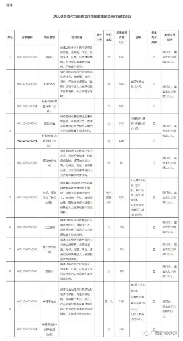 据广西壮族自治区医疗保障局网站消息,《自治区医保局自治区人力资源和社会保障厅自治区卫生健康委关于将部分治疗性辅助生殖类医疗服务项目纳入基本医疗保险和工伤保险基金支付范围的通知》日前正式发布。《通知》提出,将“取卵术”等部分治疗性辅助生殖类医疗服务项目纳入基本医疗保险和工伤保险基金支付范围。通知自2023年11月1日起执行,国家和自治区有新规定的,从其规定。