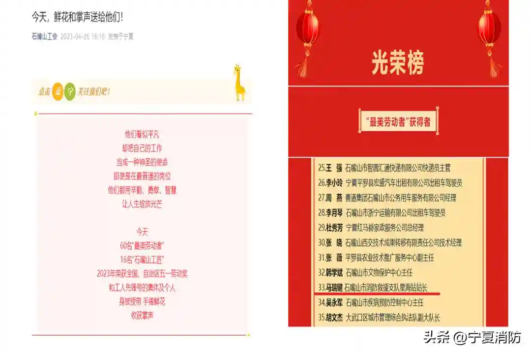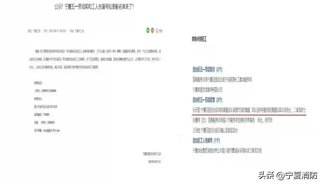 在“五一”国际劳动节之际,全国和宁夏回族自治区、各地市相继召开庆祝“五一”国际劳动节暨“五一”表彰大会。石嘴山市消防救援支队青山特勤站被中华全国总工会授予“全国工人先锋号”称号,吴忠市消防救援支队金积特勤站二级消防士任天歌荣获“自治区五一劳动奖章”,石嘴山市大武口区星海消防救援站站长马瑞键被石嘴山市总工会评选为“最美劳动者”。