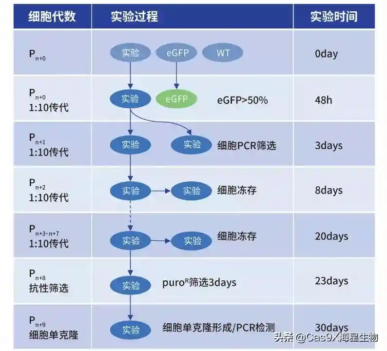 优化的gRNA引导Cas9蛋白对特定位点进行切割,产生DNA双链断裂(Double-StrandBreak,DSB),并诱导同源线性化DNA片段(携带抗性基因和荧光基因)整合到该位点,再通过抗性药物(puroR)或荧光(eGFP)进行筛选,从而获得基因敲除的细胞和单克隆。