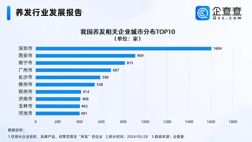 企查查数据显示,从城市来看,深圳现存1604家养发相关企业,断层领先全国其他地区。西安、南宁分别现存909家、815家,位居前三。此后是广州、长沙、柳州等地。
