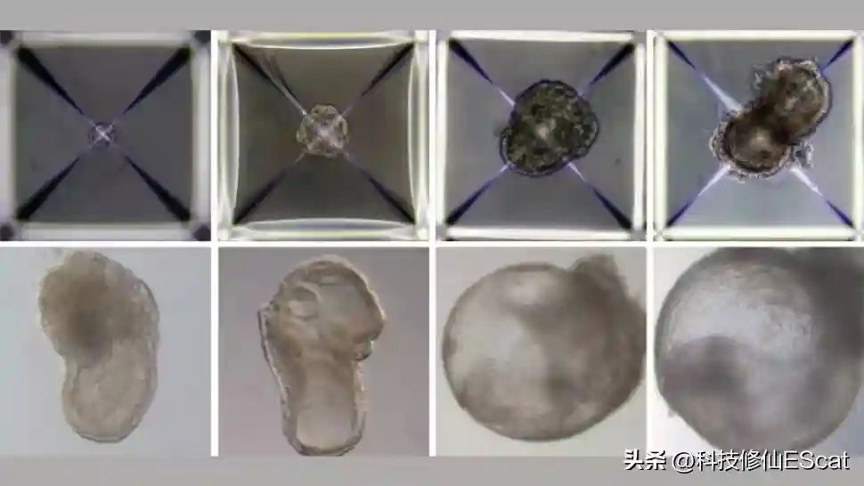 不出意外,这三种细胞很快聚集在一起形成团块,只是10,000个细胞团块中只有大约50个继续发育成胚胎样结构,且只在生物反应器中存活了8.5天。
