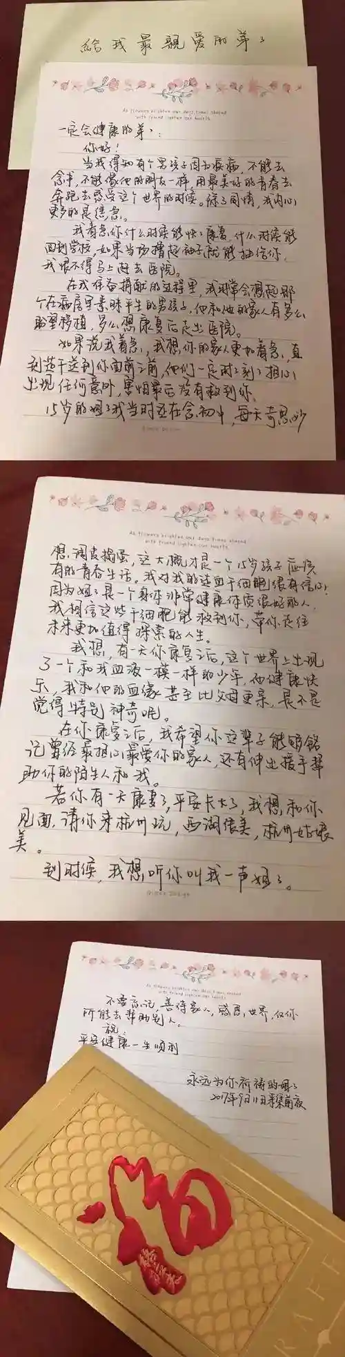 在信里,许艾菲写了很多鼓励的话,希望他可以战胜病魔,在信的结尾,她写道: