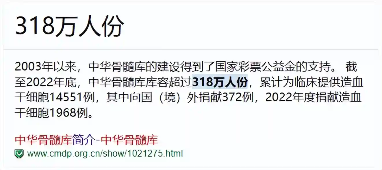 截止17年12月,中华骨髓库人数为265万人份,2023年已达318万人份。