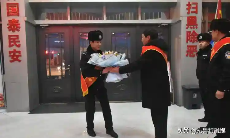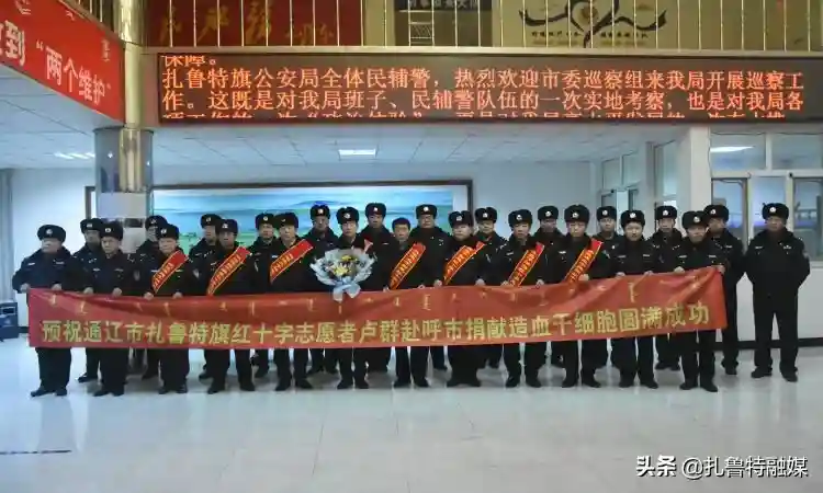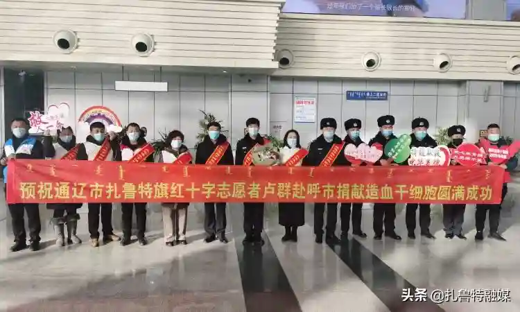 12月23日一大早,扎鲁特旗公安局治安大队的20多位民辅警代表加油鼓劲,欢送他们的战友卢群赴呼和浩特市捐献造血干细胞。面对亲友们的鼓励,手捧鲜花的卢群眼神格外坚定。